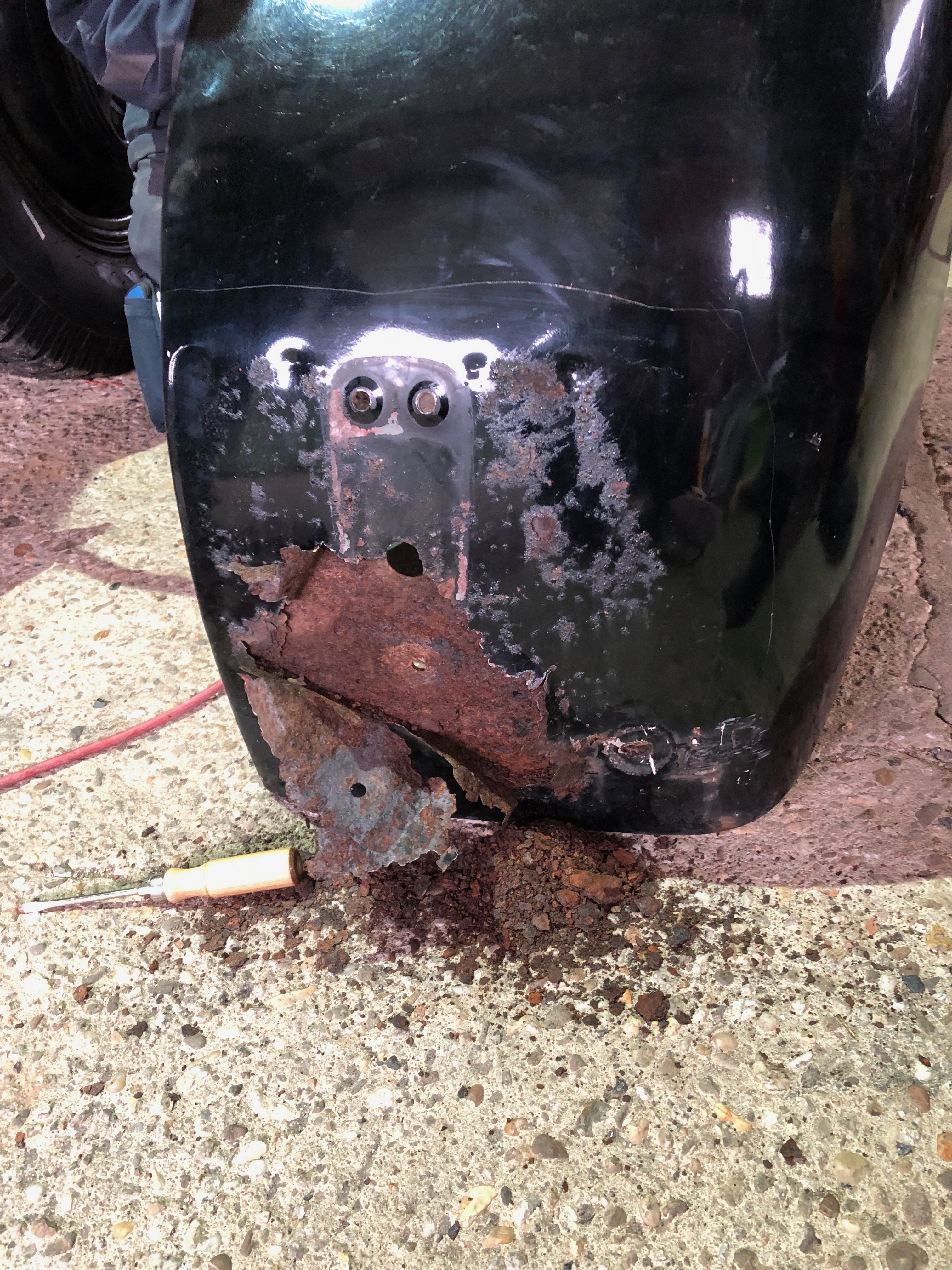 Der Kotflügel in Fahrtrichtung links wurde zur Bearbeitung demontiert. Es stellte sich heraus, dass der Kotflügel in einem viel schlechterem Zustand ist als es Oberflächlich zu sehen war. Der Kotflügel wurde nicht mehr angebaut. Wir bemühen uns aktiv um einen neuen Kotflügel.