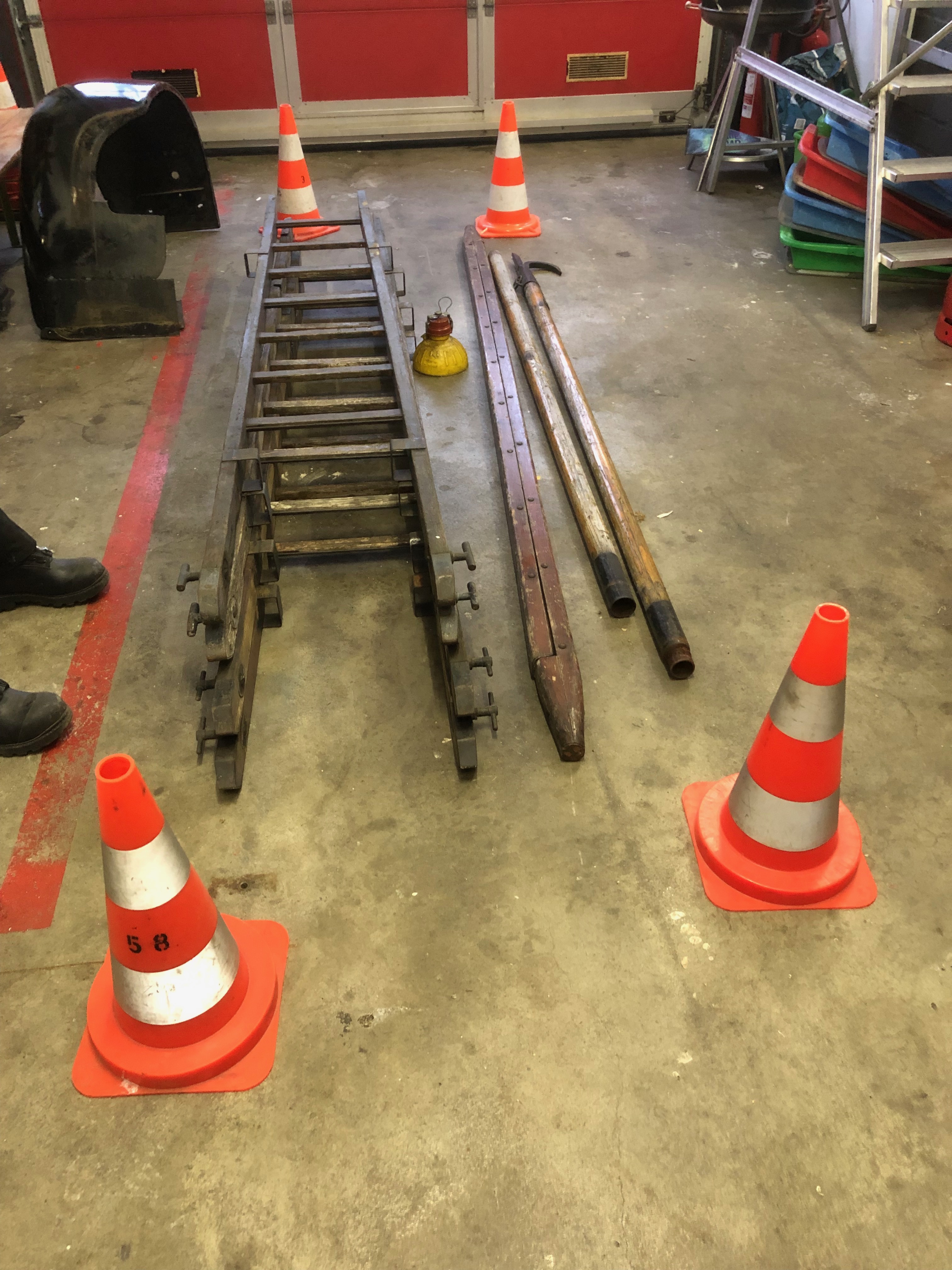 Für die nächsten Arbeiten wurden die Holzleitern und der Einreißhaken zum schleifen und lackieren im GH Hemmerden gelagert.