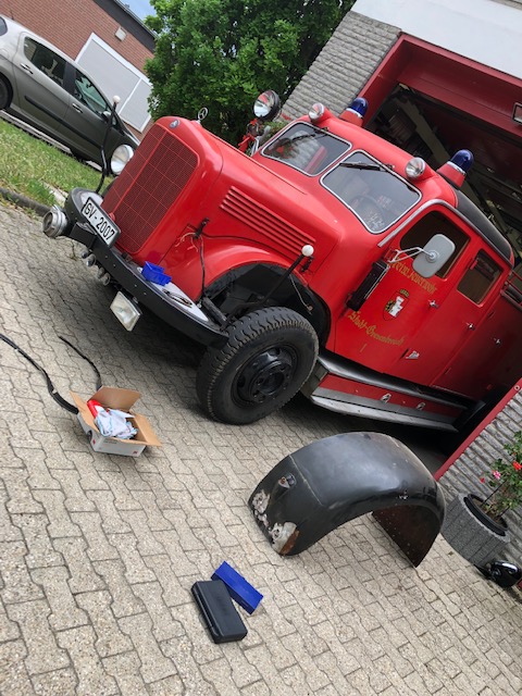Da am Samstag die Hochzeit eines Feuerwehrkameraden ansteht, wurde das TLF 15 mit dem Ersatzkotflügel ausgestattet. Der Kotflügel wurde aufgearbeitet, angepasst und Scheinwerfer sowie Blinker angebaut und angeschlossen.